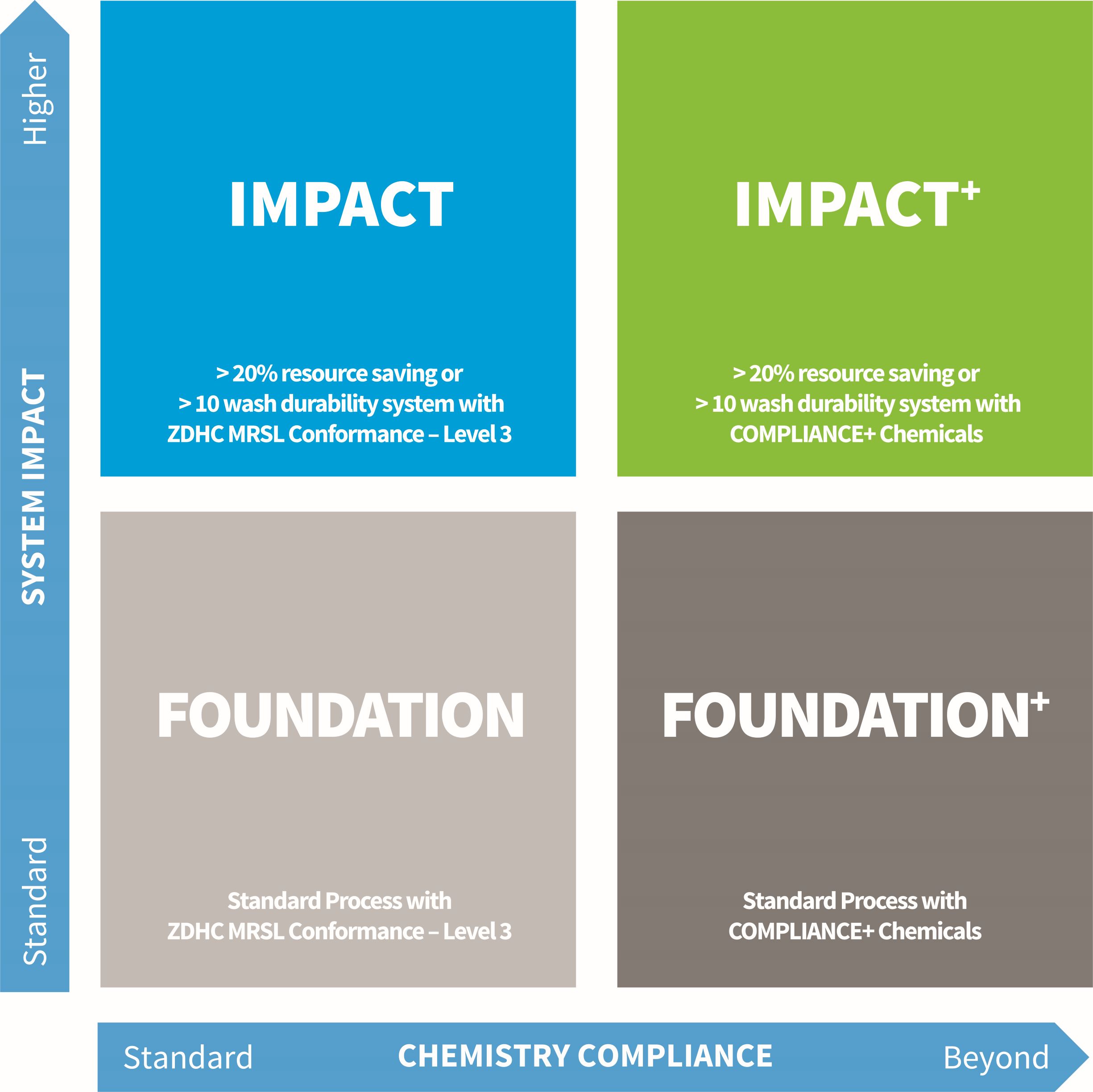 Archroma’s Super Systems+ suite encompass wet processing solutions that deliver measurable environmental impact; durable colors and functional effects that add value and longevity to the end product; and technologies that eliminate harmful or regulated substances. It will allow brands and mills to achieve their desired level of sustainability through measurable resource savings and cleaner chemistries. (Please refer to the Impact Matrix, below.)