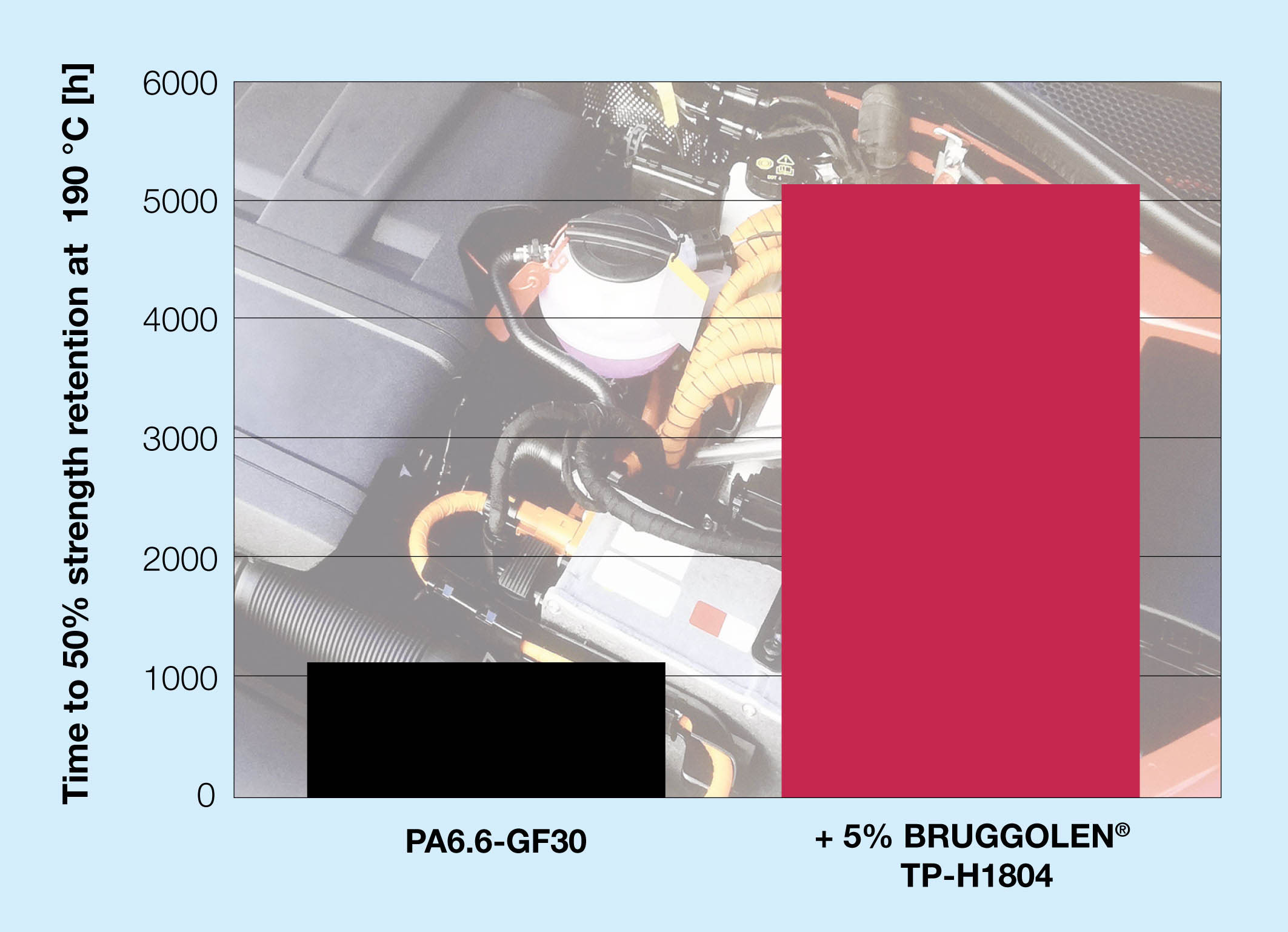 For example, the tensile strength of a glass fibre reinforced PA6.6 with the addition of 5 % is still over 50 % of the initial value after 5,000 hours of heat ageing at 190 °C; the un-stabilised material barely reaches this limit at 1,000 hours. At 170 °C, thanks to its outstanding efficiency, even 2.4 % is sufficient to exceed the 5,000-hour mark. Thus, BRUGGOLEN TP-H1804 is a product which, through its flexible dosing capability, allows moulded component service life to be adapted to expected thermal loads.